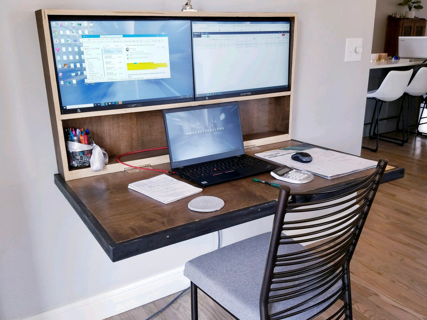 When folded up, this piece looks like a decorative framed painting. When folded down, it is a fully functional work station, complete with integrated dual monitors. One plug into the wall and one cord into the computer and the whole station is operational.