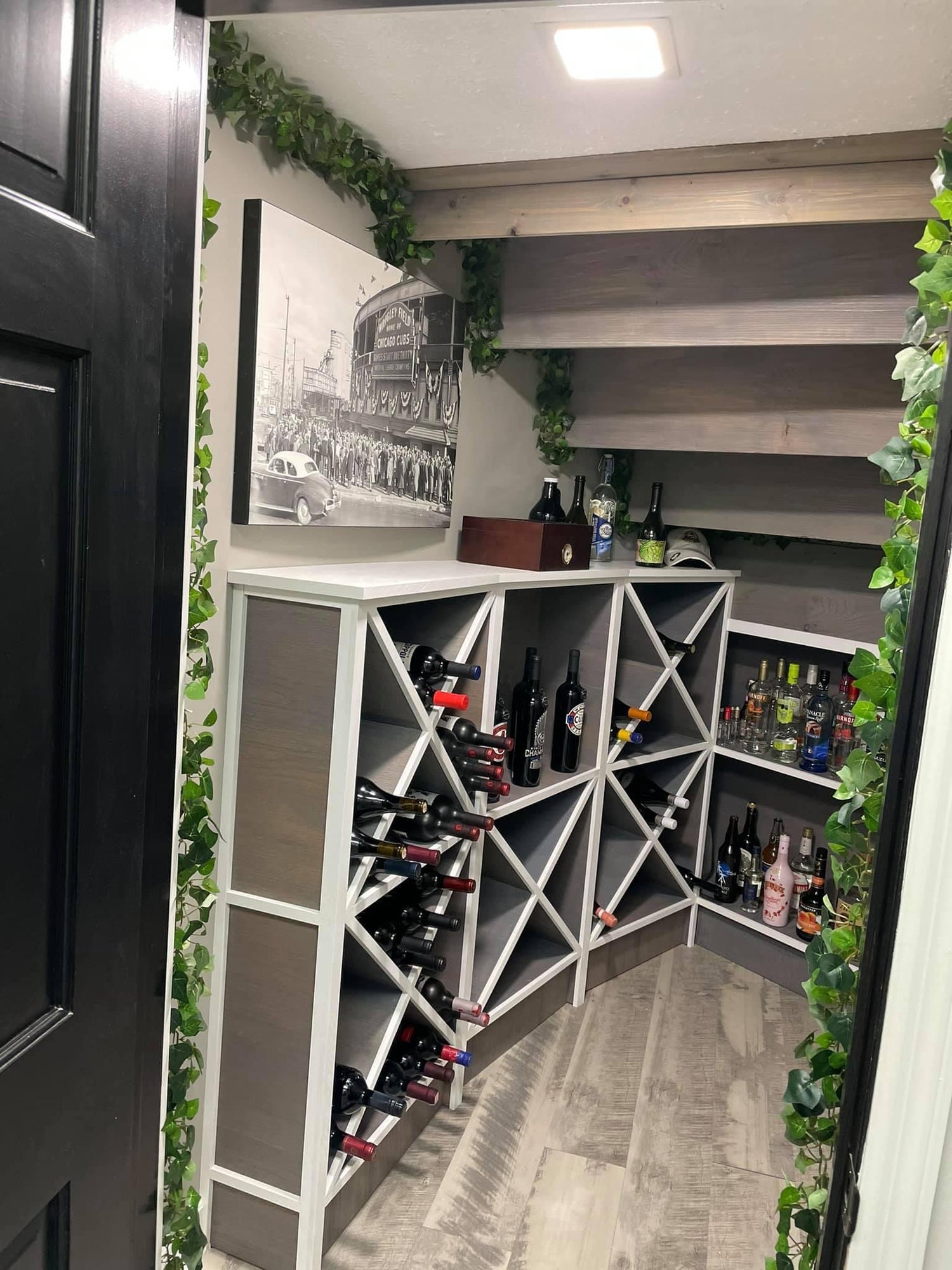This client wanted to utilize the space under their staircase as a wine cellar. The tricky thing with curved walls is making straight wine racks fit. This wine rack made excellent use of the space and created room for a massive selection of wines.