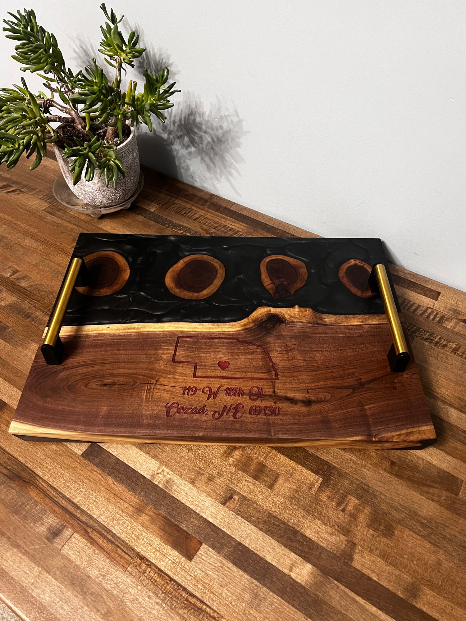 These walnut branch cookies from the recipient's grandparent's family home were incorporated with a walnut slab and epoxy pour to create a stunning serving tray. The state map marking the location of the home and filled with epoxy made this a piece the family will be able to pass down for generations.