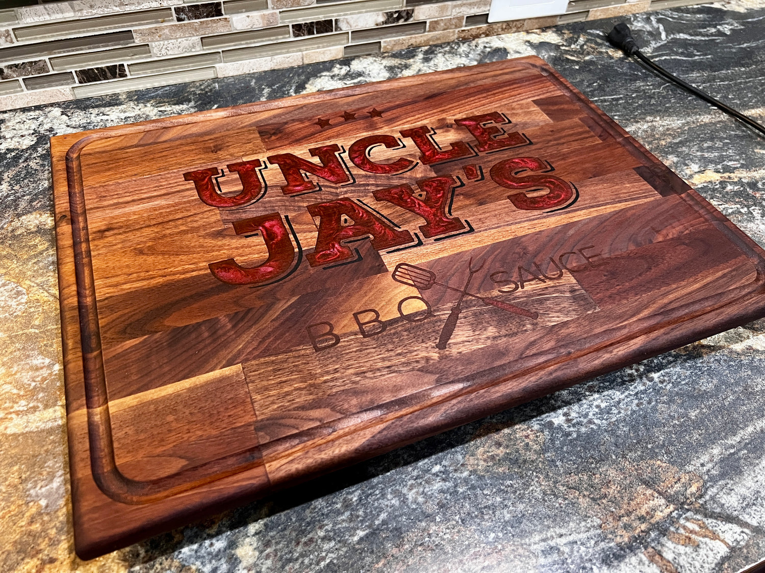 A BEEFY walnut butcher block brisket board with the logo for Uncle Jay's BBQ Sauce engraved and epoxy filled.