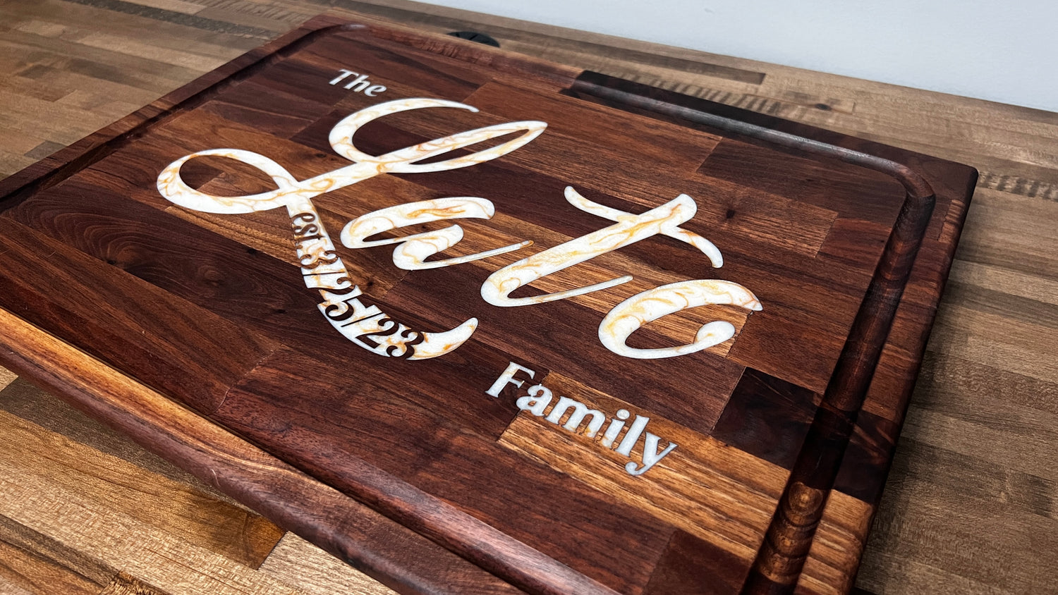 This 1.5" thick walnut butcher block cutting board featured the last name of the happy couple as well as the date of their wedding. Tasteful bow ties were functional as well as decorative while a juice groove makes this board as functional as it is beautiful.
