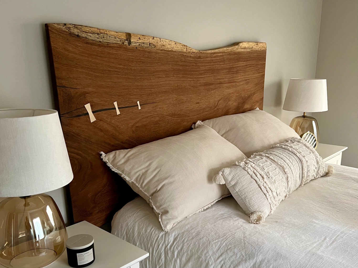 A hanging headboard made from a naturally stunning Parota slab with brass bow-tie inlays.