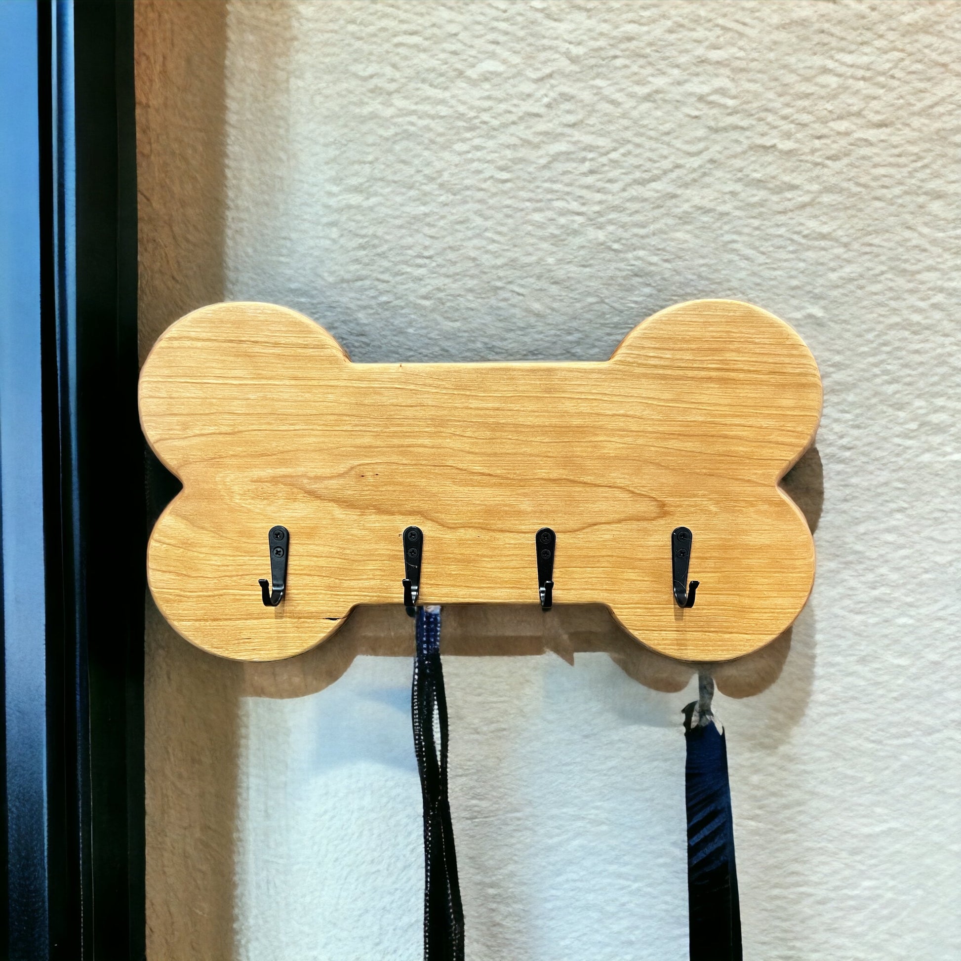 This whimsical leash holder in the shape of a dog bone is made from cherry wood with four black hooks. Keyhole mounts on the back let you securely mount it to the wall, ensuring your keys and leashes are ALWAYS ready for a walk or trip to the dog park.