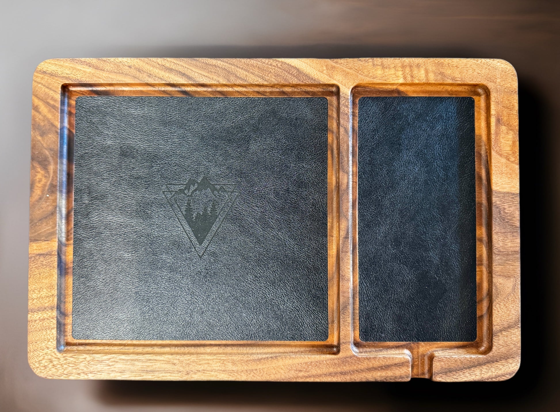 These every-day carry trays are designed to elegantly organize your essentials in style. Handcrafted from premium solid woods and accented with a sleek leather inlayed base, this tray exudes sophistication and functionality.